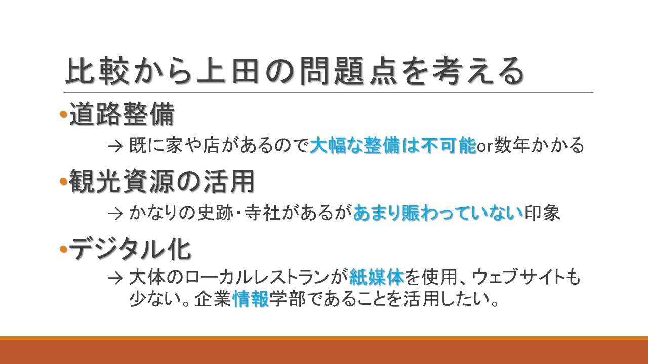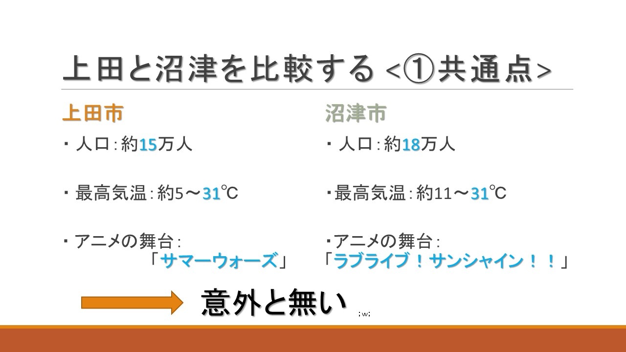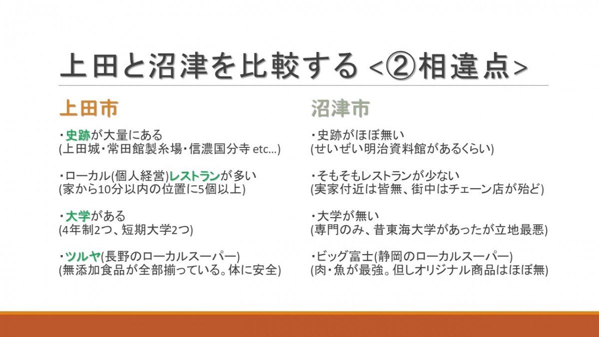 現在住んでいる、長野県上田市と、僕の地元である静岡県沼津市を比較し、両者の良い点、悪い点をまとめたPowerpointのスライドです。
