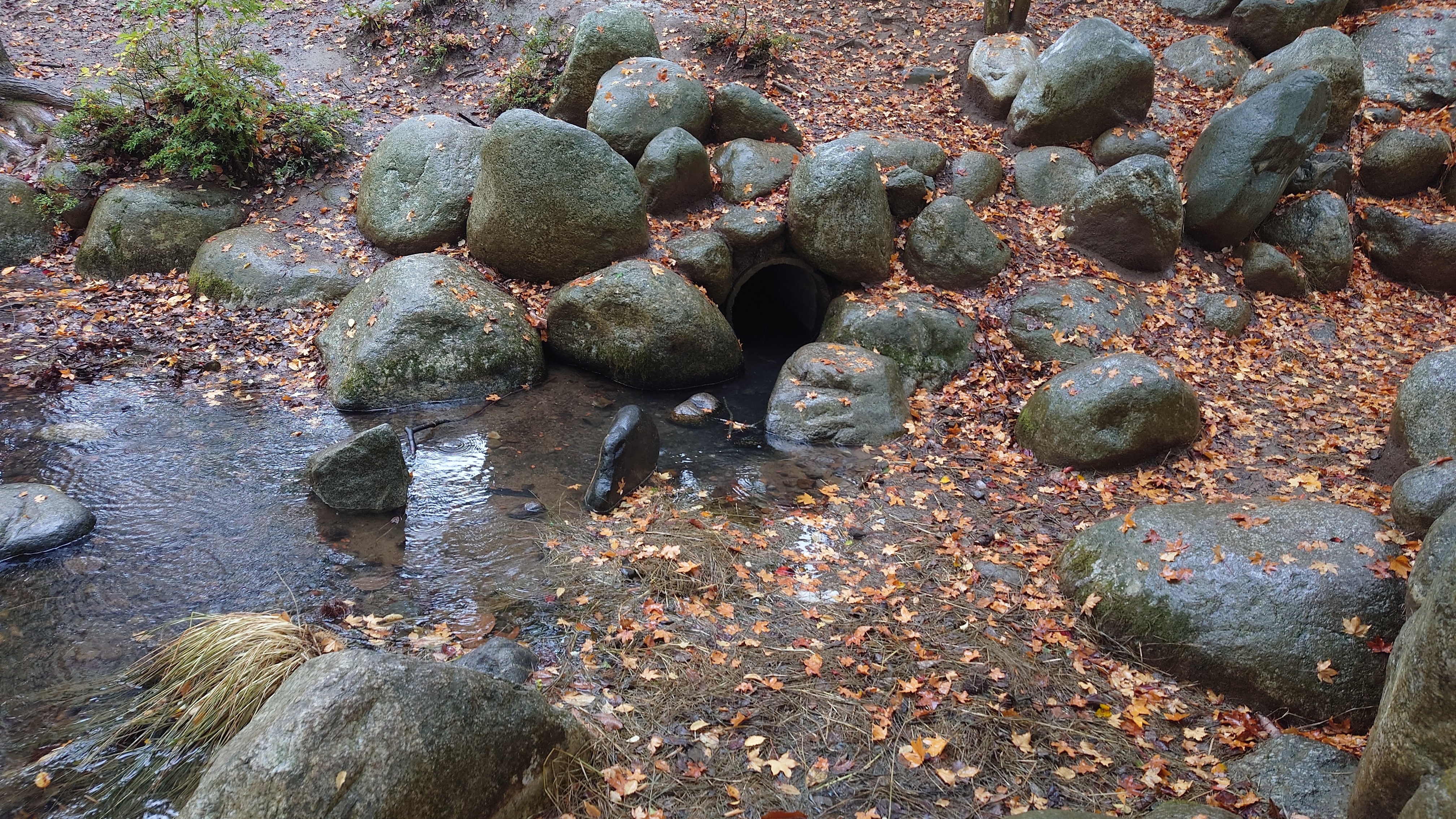 公園内を流れている小川の始まりは滝なのかなと思わせて、真ん中にある土管から流れ出ているという。「滝じゃないんかい!」と思ってしまった小川。