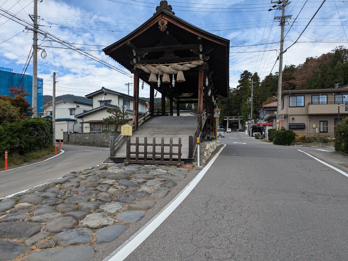 いつもこの道を通勤で通るたびに、道路のど真ん中に鎮座するこの建築物は何だろうと思っていました。調べてみると、この橋は「諏訪大社下社春宮下馬橋」という名の貴重な橋でした。諏訪大社下社春宮大通りの中央にある屋根付きの反橋で、昔、春宮参拝の際には、殿様でも籠や馬から降りなければならなかったそうです。現在では、年に二度の祭りの時に神輿だけが通れるようになっています。