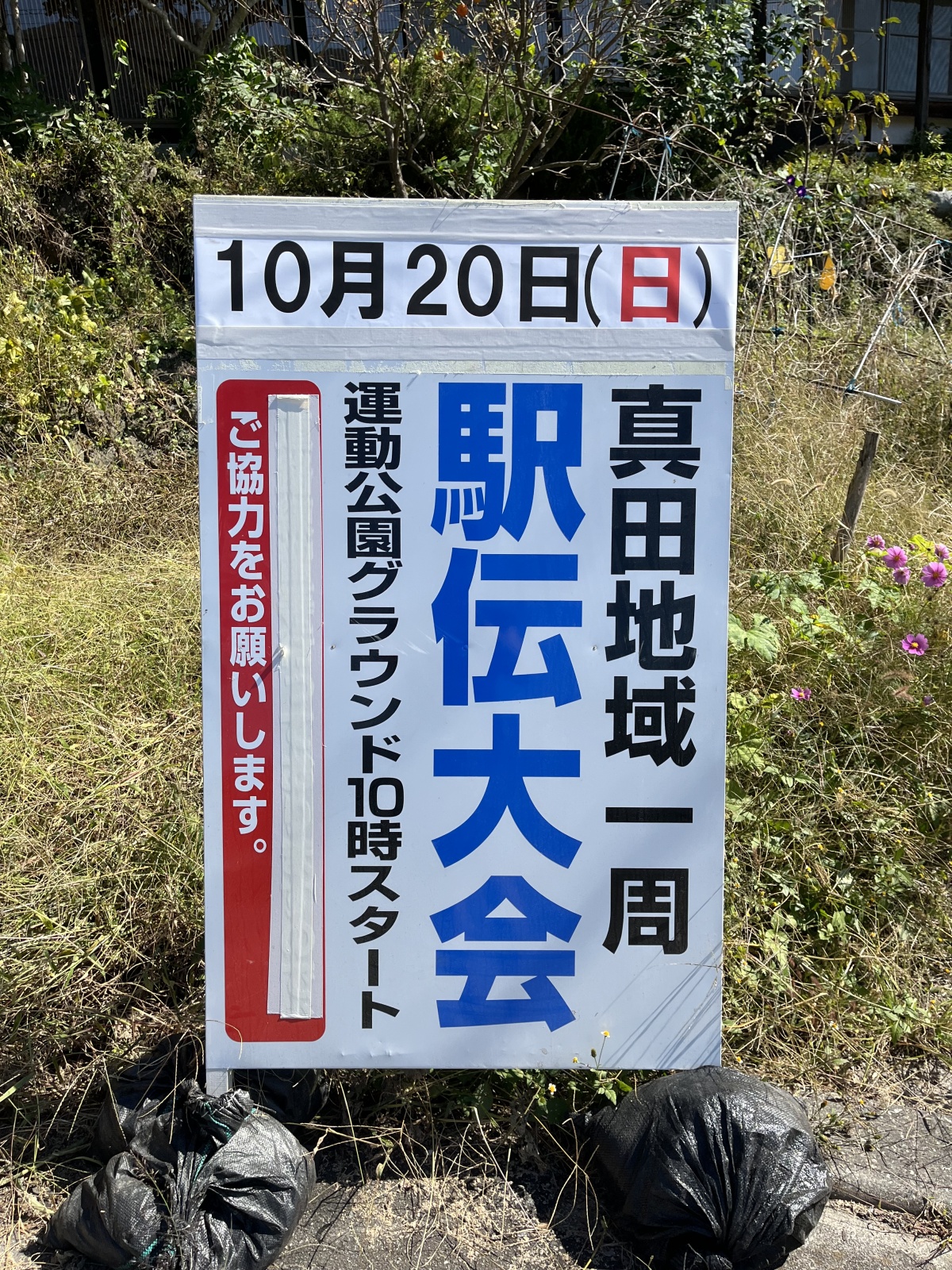 道路わきの看板に、ふと目を奪われることはありませんか? 今回の看板はこちら。 第66回目を迎えた真田地域一周駅伝。 長い歴史に、様々な問いが浮かびます。