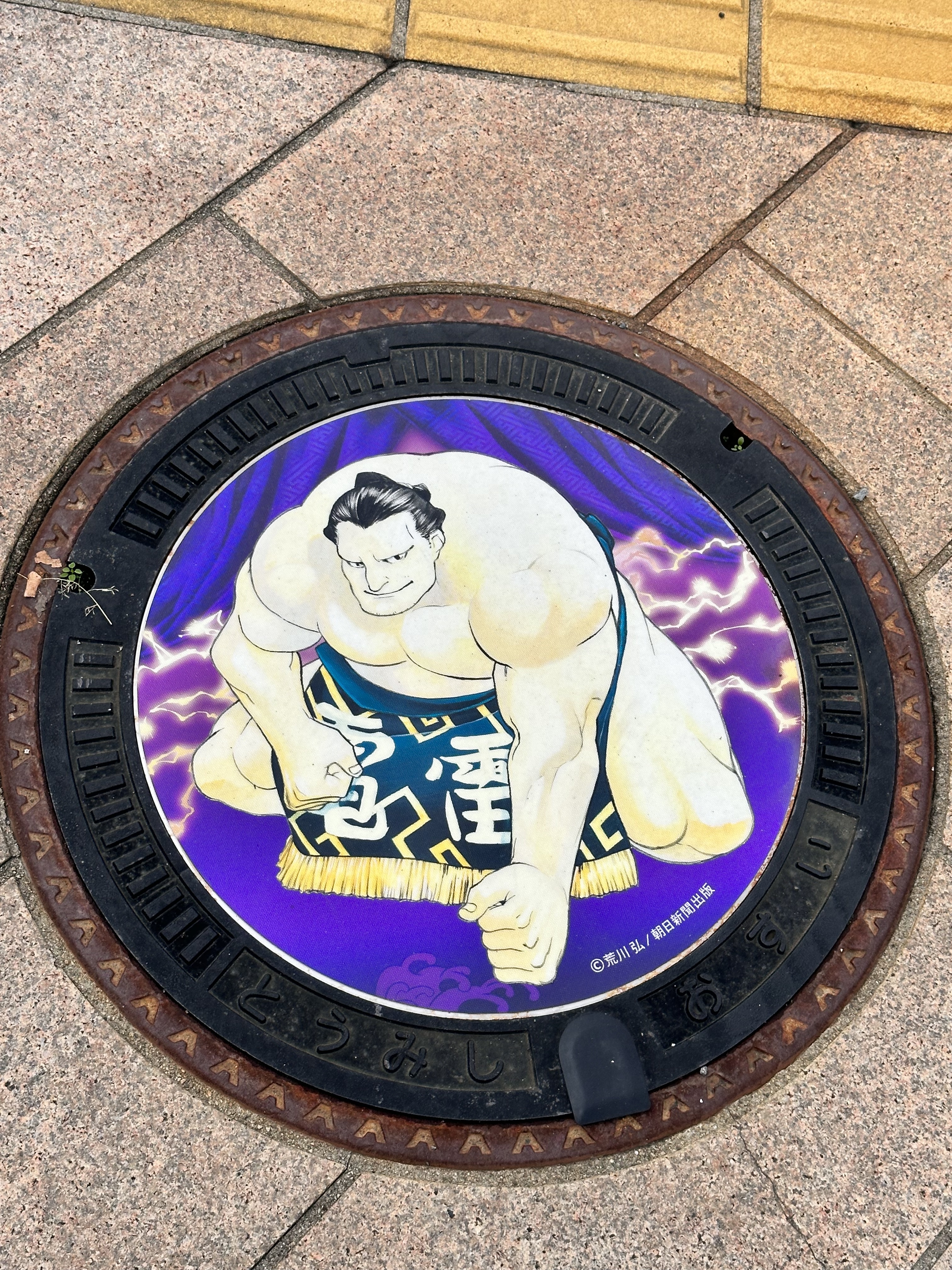 東御市の有名人「雷電為右衛門」のマンホールがありました。市内に4カ所しかなく、何回も歩いている道でしたが、今回初めて気づきました。