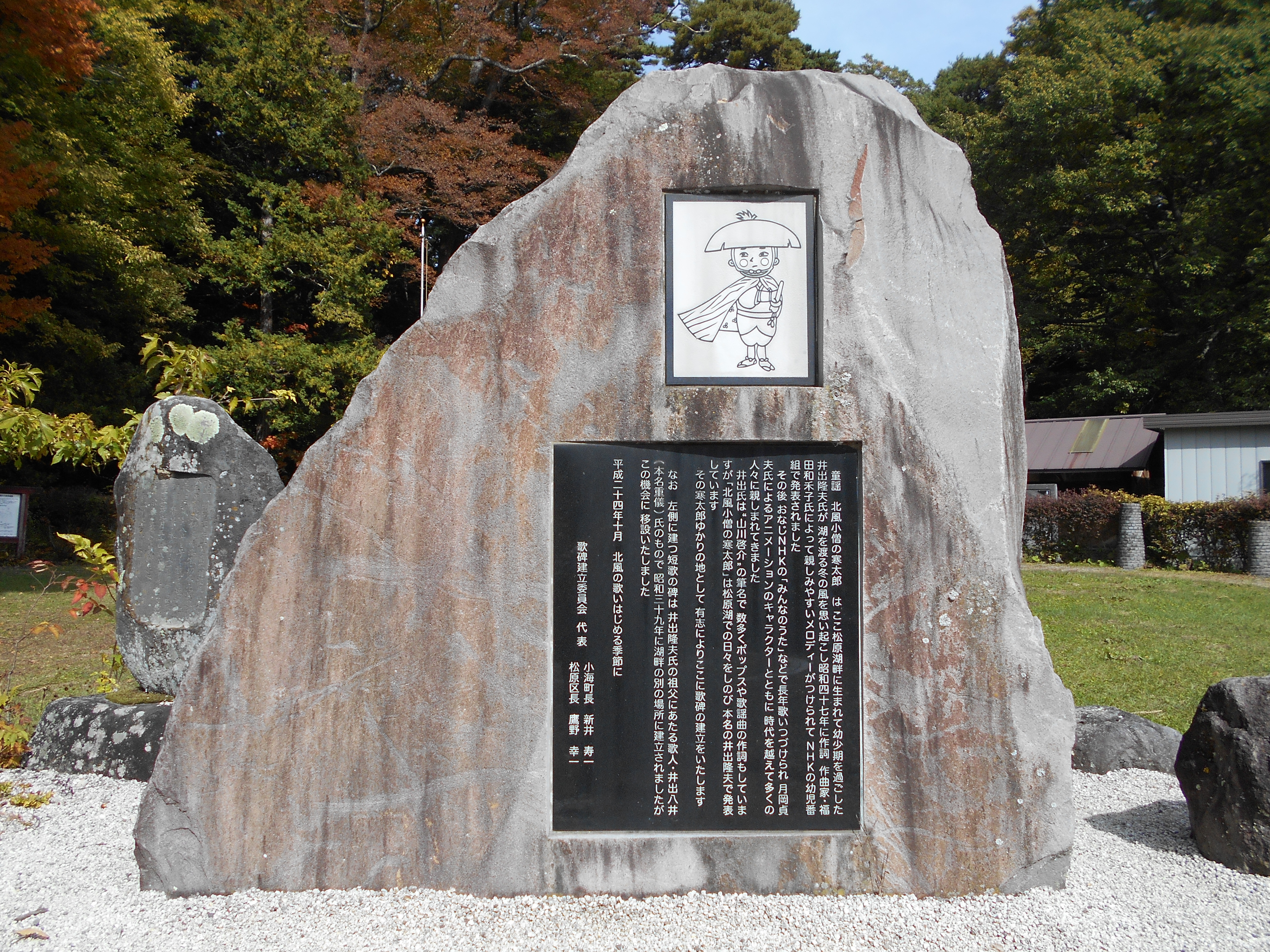 上=松原湖。もうすぐ本格的な紅葉シーズンです。 下=松原湖のほとりに「北風小僧の寒太郎」の歌碑があります。碑の表面に歌詞が彫られています。この歌碑の存在を今回初めて知りました(しかも寄り道でした)。