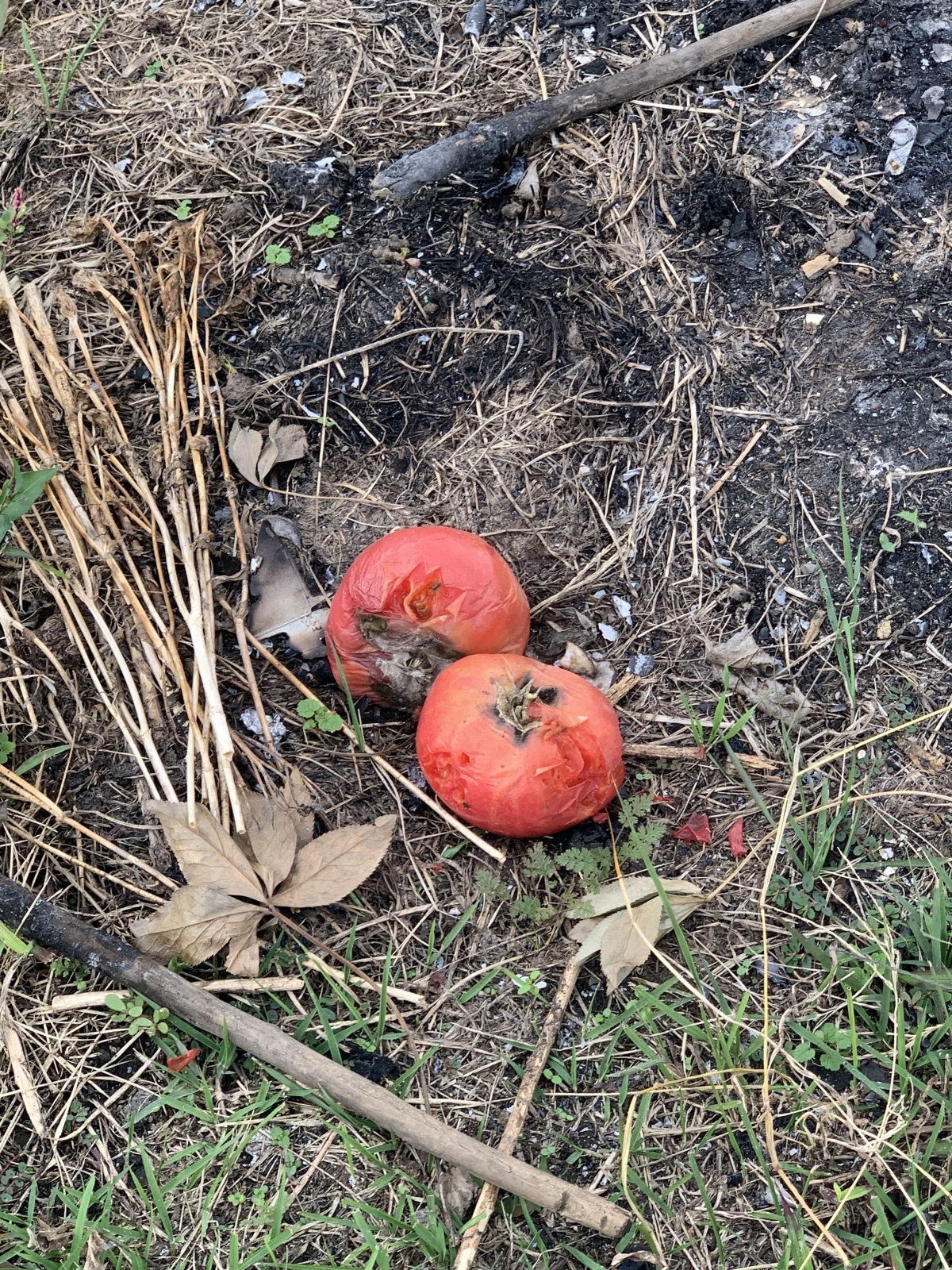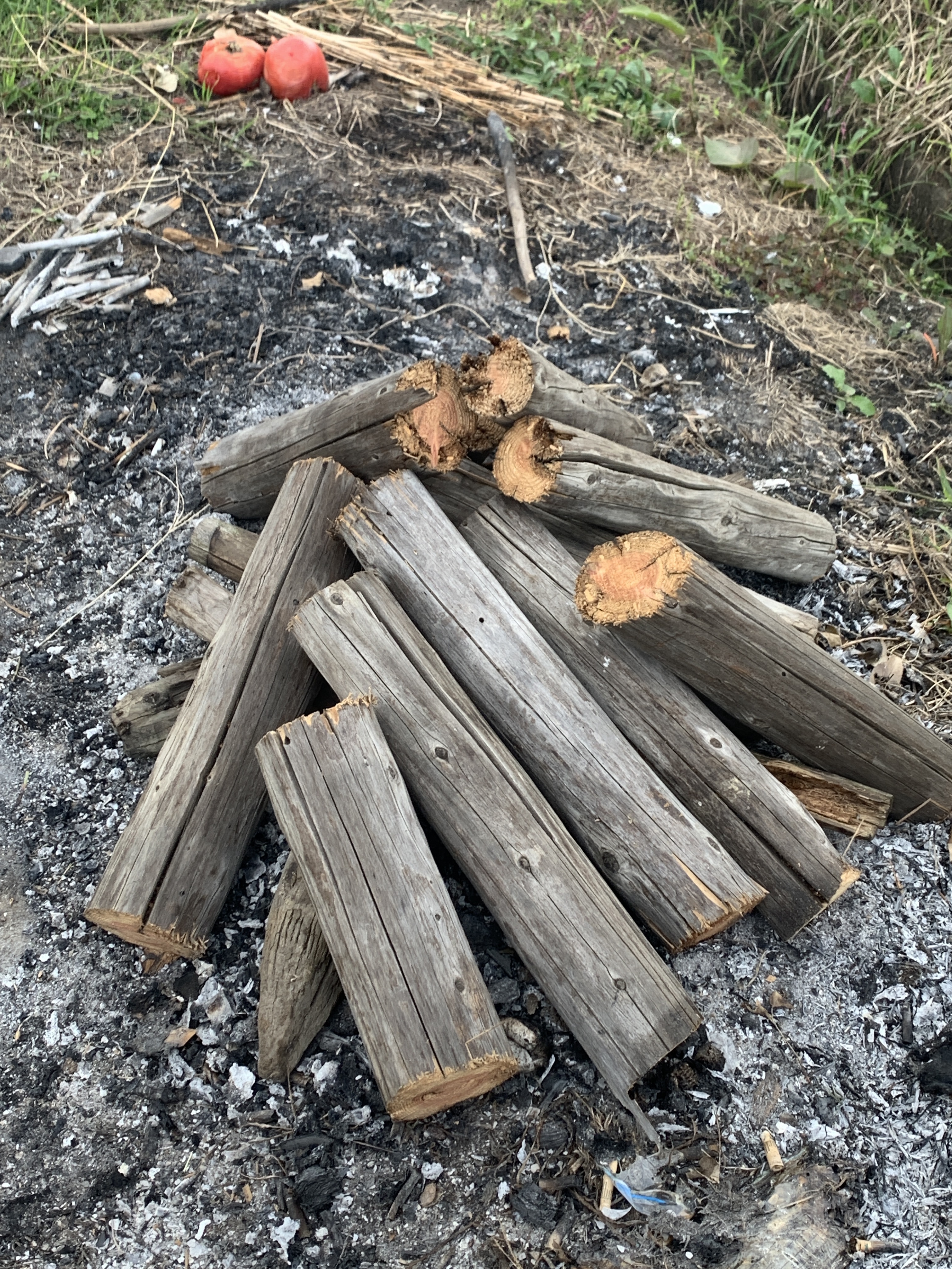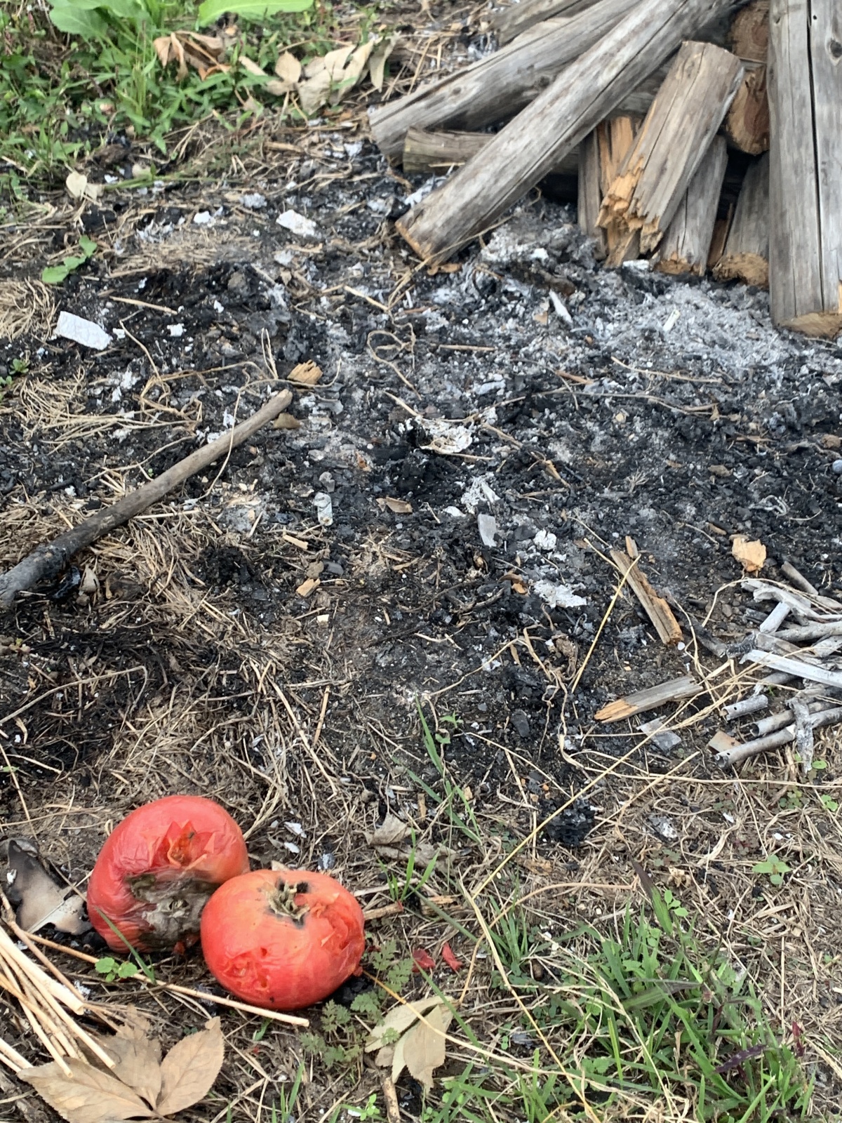 燃えた跡とトマト?と薪(新品)?