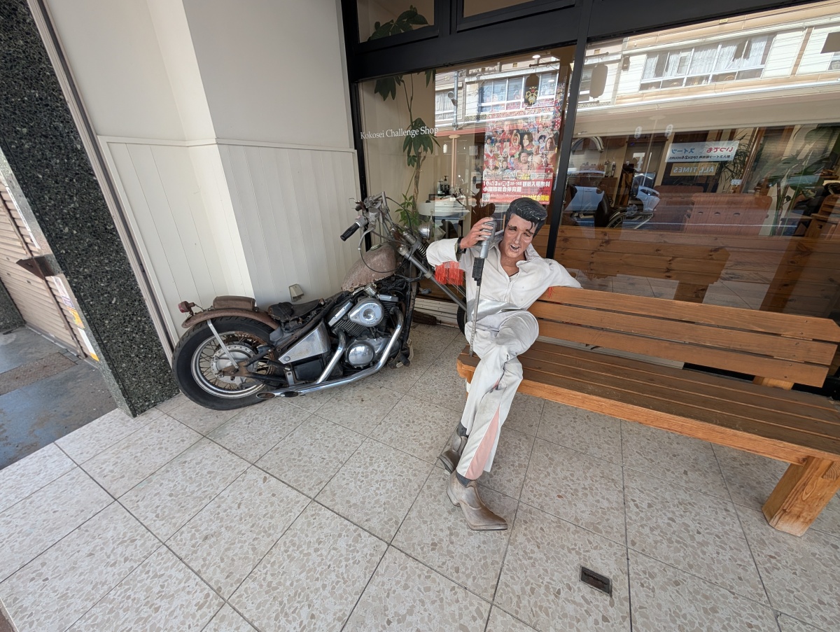 美容室前のベンチに鎮座している。存在感がすごい。マイクを持ち、近くには古いバイク。何者???