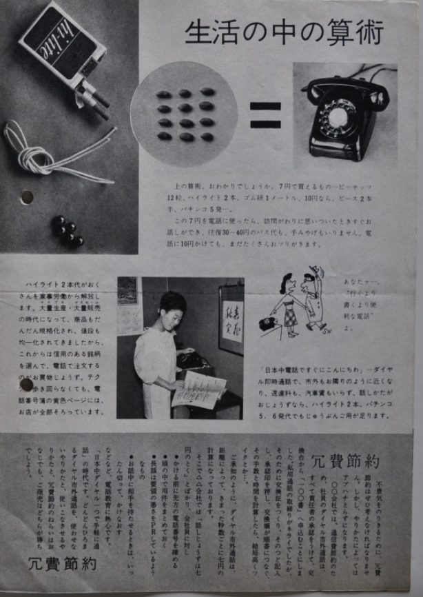 黒電話が登場し、どのように変わったのかがわかりやすく書かれている記事だ。連絡手段が手軽となり、どこでも繋ぐことができると書かれている。特に今までかかっていた汽車代などがかからなくなったと安く済むことが大きくアピールされており黒電話は革新的であったのだろう。おしゃべりがうまくなることが節約術であると書かれていたのが面白かった。