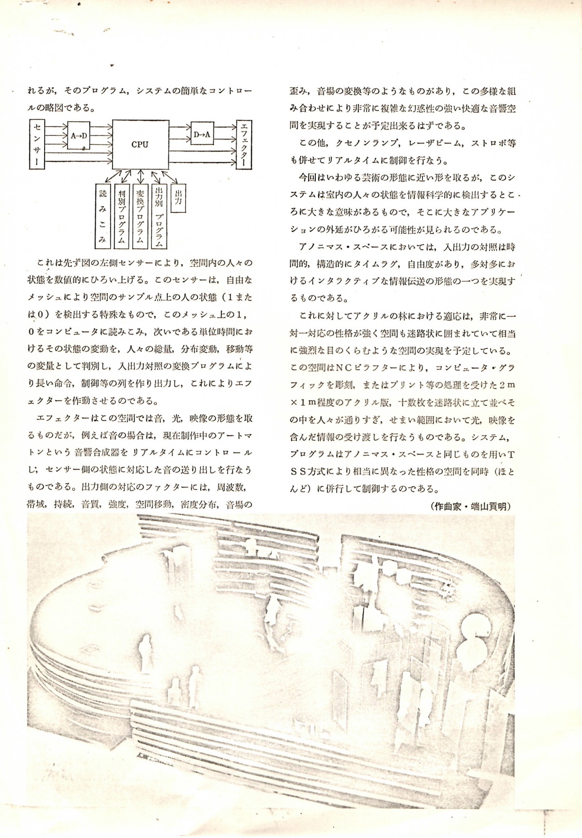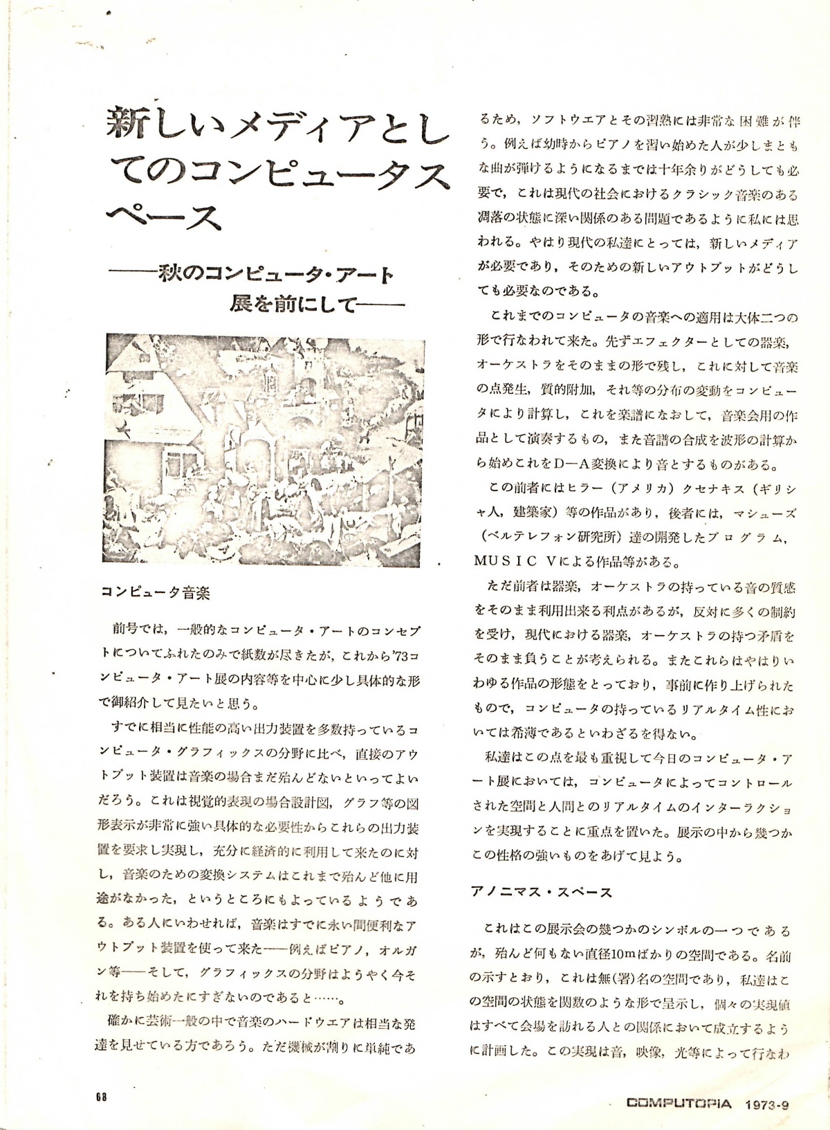 1973年、情報化週間の催しとしてソニービルで開催された「コンピュータ・アート展」(開催期間:10/5~10/21)に先駆け、アート展の目指す方向、目的、内容等について紹介した記事。3回にわたる連載記事の2番目。