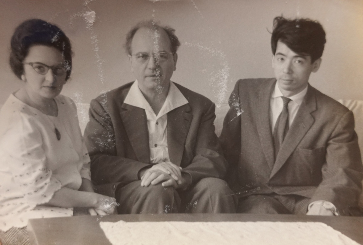 端山貢明と恩師オリヴィエ・メシアン(1908-1992)夫妻の記念写真。端山のフランス留学中(1957年10月~1959年7月)、メシアン先生宅で撮ったものと思われる。