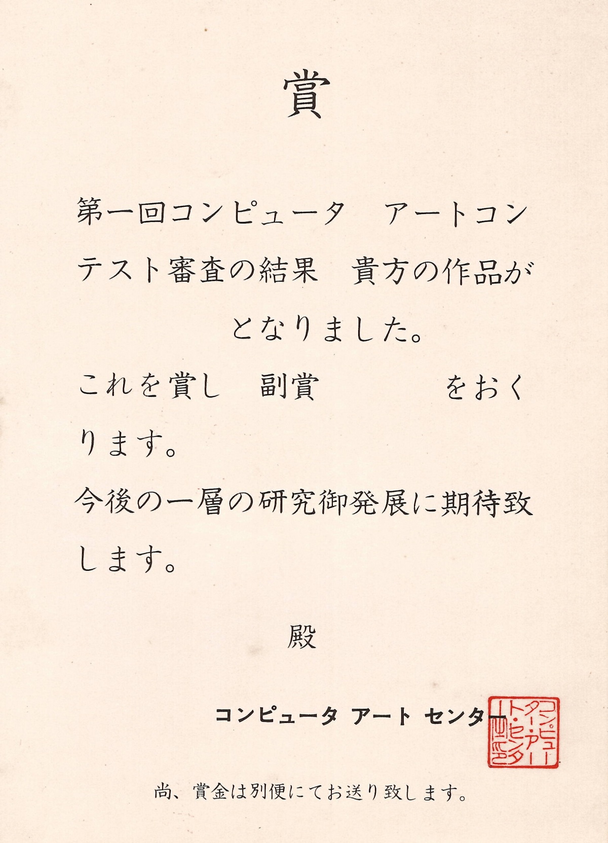 第1回コンピュータアートコンテストの賞状で、コンピュータアートセンター主催で行われた。