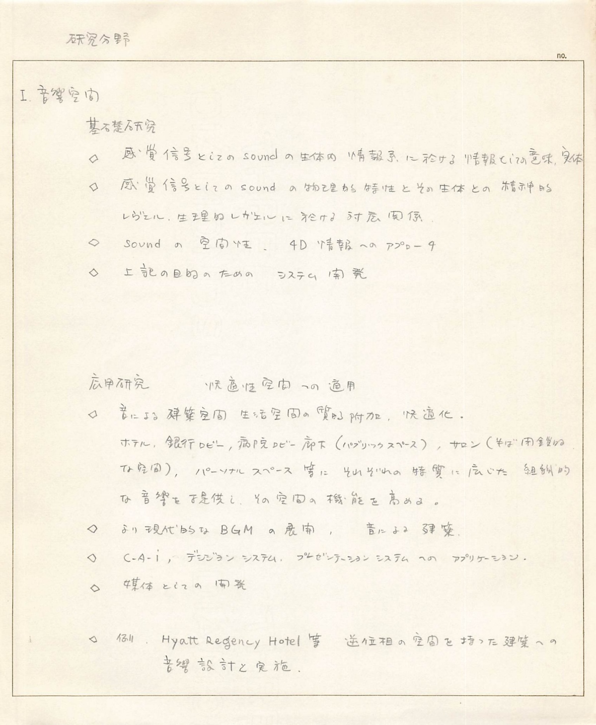 会場の音響空間について「サロン パブリックスペース パーソナルスペース等音響による生活空間の質的附加 快適化」と記されている。音響空間の研究課題が箇条書きされている。