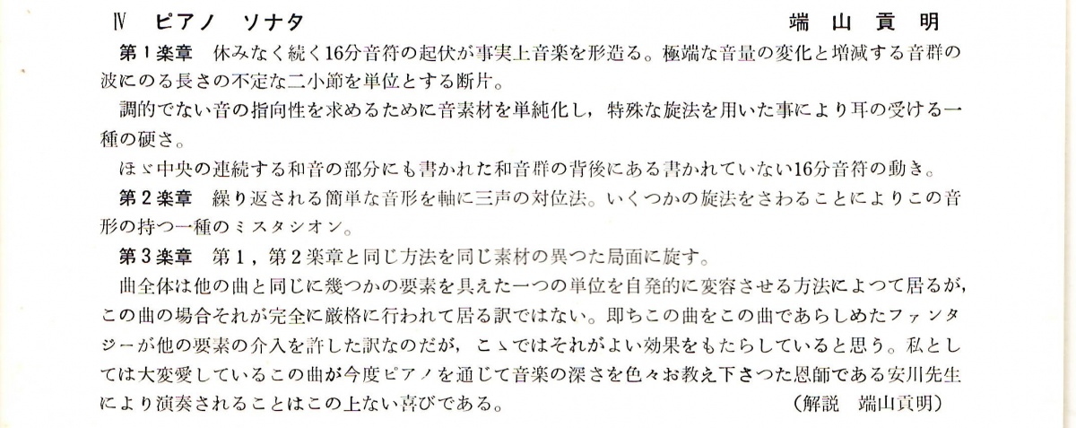 《ピアノ・ソナタ》(解説:端山貢明) 「安川加寿子ピアノ独奏会」冊子 1962/11/26掲載 《ピアノ・ソナタ》は1960年に作曲された作品。「第17回芸術祭参加 安川加寿子ピアノ独奏会」で演奏された。