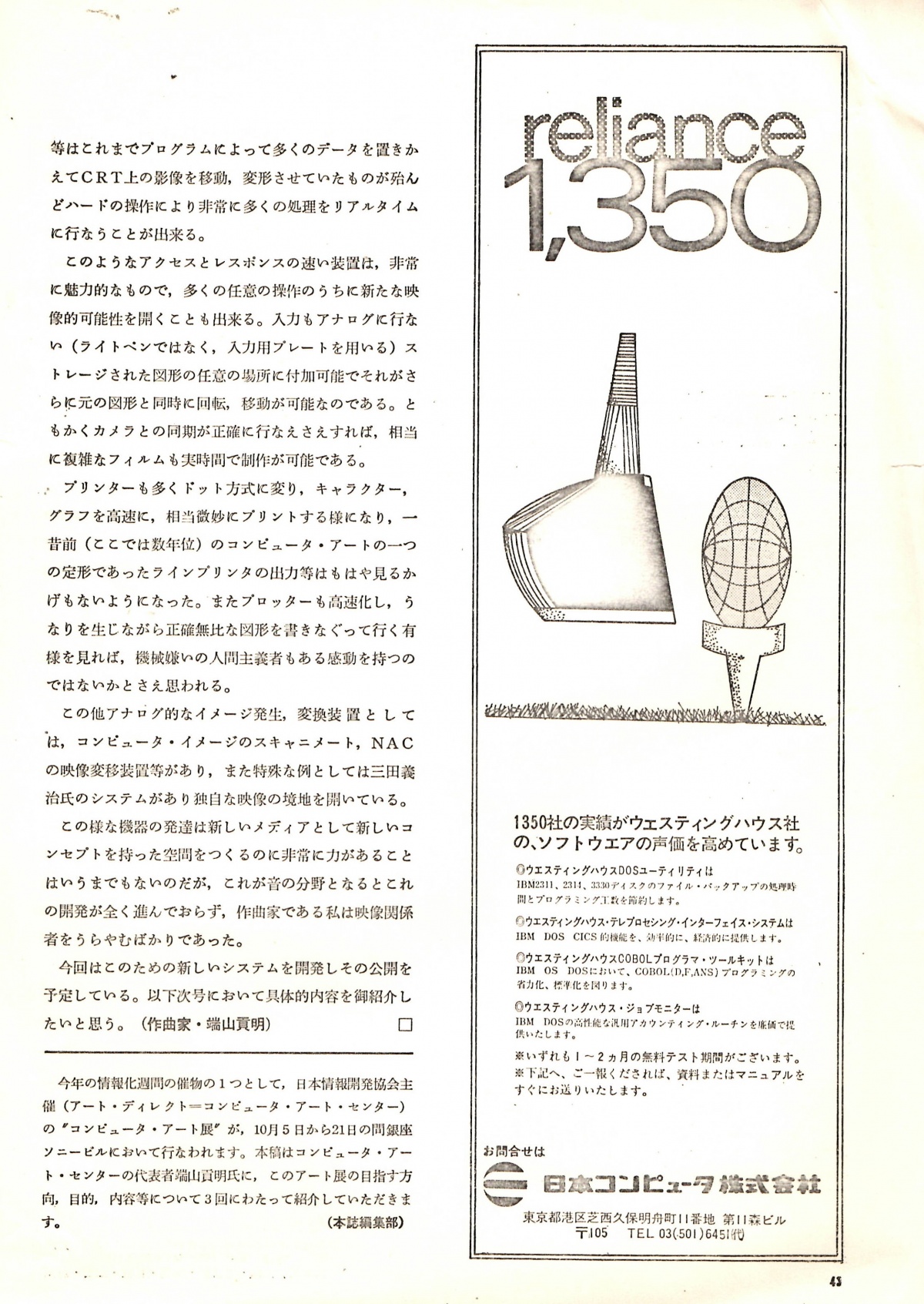 1973年、情報化週間の催しとしてソニービルで開催された「コンピュータ・アート展」(開催期間:10/5~10/21)に先駆け、アート展の目指す方向、目的、内容等について主催者の端山貢明が紹介した記事。