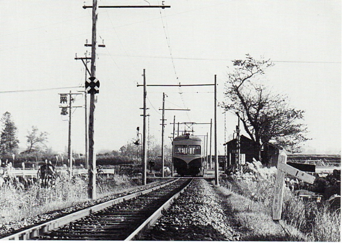 三山電車は羽前高松駅を出るとまもなく新田駅に停車する。新田は寛永年間に佐藤清助ほか47人が開墾した土地である。新田の停留所は田園のなかにぽつんと立っていた。谷沢や新田、慈恩寺、日和田の人びとが利用した。西部公民館に通じる「みやま橋」の場所には三山線の鉄橋が架かっていた。現在は三山線ほ記念したミニ公園「三山広場」がある。(寒河江市・昭和49年)