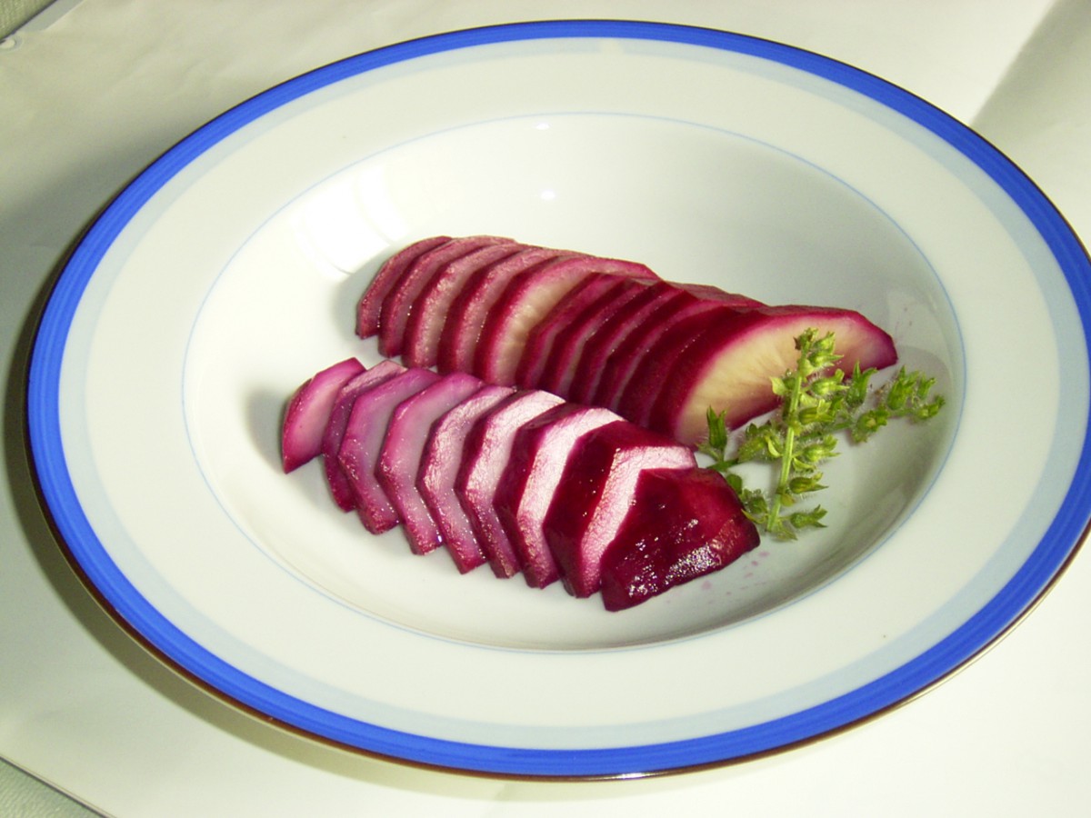 ②大根の皮をむき、縦半分に切って山ぶどう床に入れ、空気をぬいておきます。