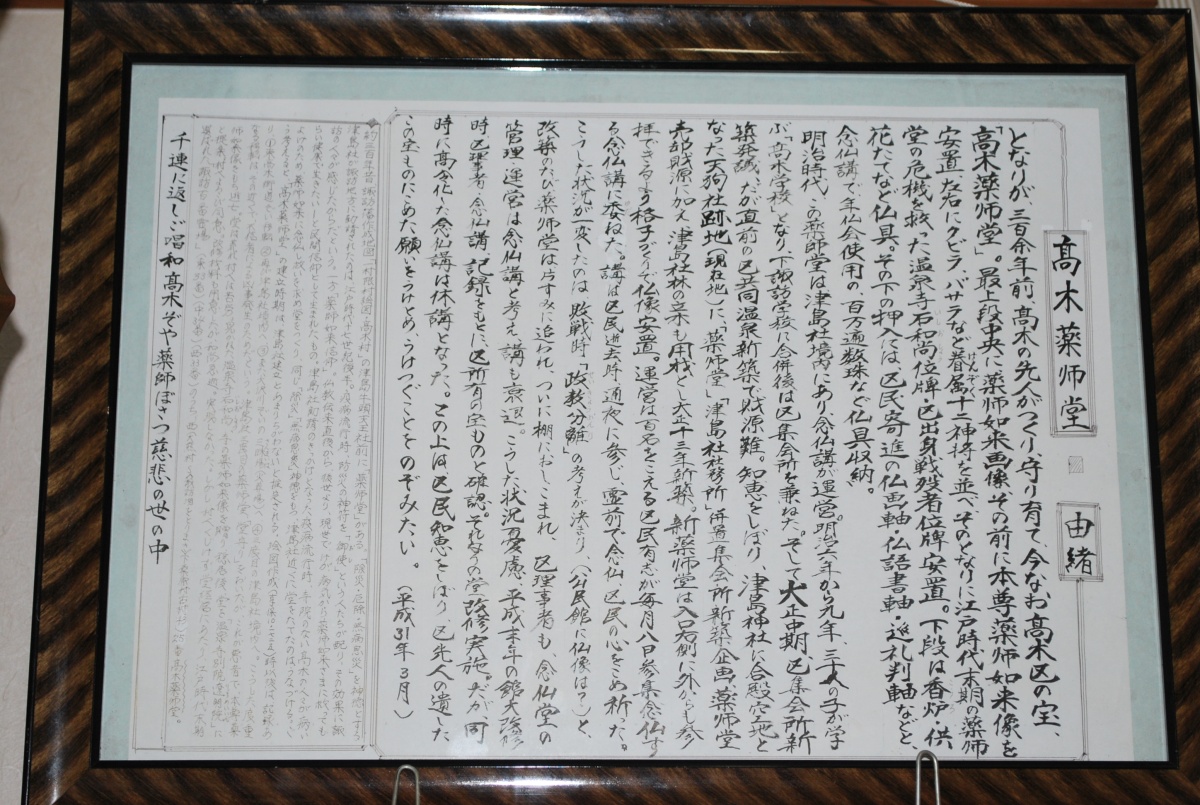 明治時代子の薬師堂は津島神社境内にあり、念仏講が運営。明治6年から9年三十人の子が学ぶ「高木学校」となり、下諏訪学校に合併後は区集会所を兼ねた。そして大正中期、区集会所新築発議、だが直前の区共同温泉新築で財政難。知恵をしぼり、津島神社に合殿空地となった天狗社空地(現在地)に「薬師堂」「津島社社務所」併置集会所新築企画。薬師堂売却財源に加え、津島社林の立木も用材として大正十三年新築。新薬師堂は入口右側に外からも参拝できるよう格子づくりで仏像安置。運営は百名をこえる区民有志が毎月八日参集念仏する念仏講に委ねた。講は区民逝去時、通夜に参じ、霊前で念仏。区民の心をこめ祈った。こうした状況が一変したのは、敗戦時「政教分離」の考えが決まり、「公民館に仏像は?」と、改築のたび薬師堂は片すみに追われ、ついに棚におしこまれ、区理事者も念仏堂の管理・運営は念仏講と考え,講も衰退。こうした状況憂慮、平成末年の館大改修時、区理事者・念仏講記録をもとに区所有の宝ものを確認。それなりの堂改修実施。だが同時に高齢化した念仏講は休講となった。この上は区民知恵をしぼり区先人の遺した宝ものにこめた願いをうけとめ、うけつぐことをのぞみたい。(平成31年3月)