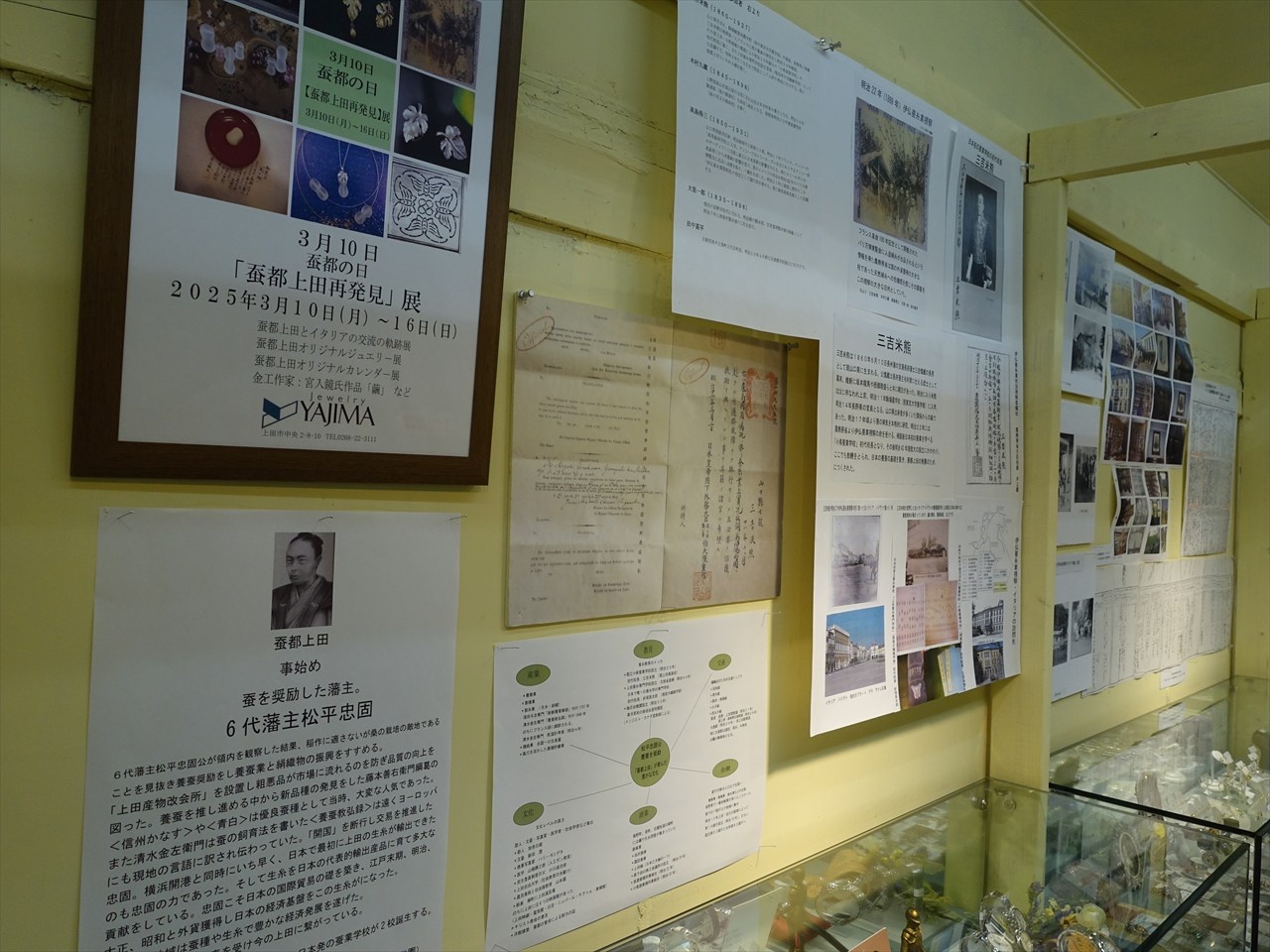 上田市海野町商店街のジュエリーヤジマさんで「蚕都上田展」が開かれています。昨日、ぶらりと立ち寄りました。展示の入口に矢島さんが掲げられていたのが「蚕都が生んだ豊かな文化」の概念図。産業、教育、交通、文化、商業、金融。蚕糸業がこの地域「上田」に何をもたらしたか、何を豊かにしたかをよくまとめられていました。