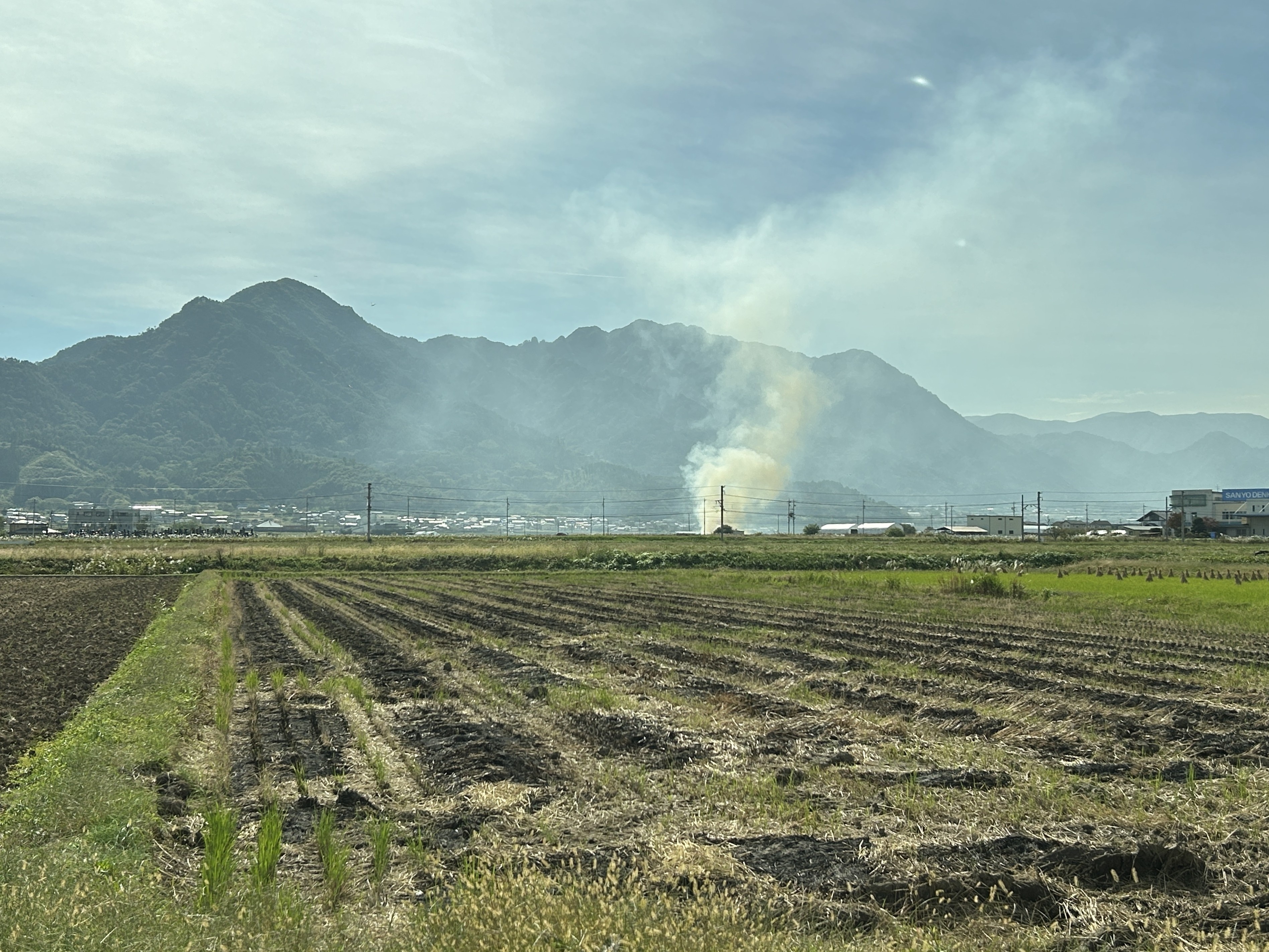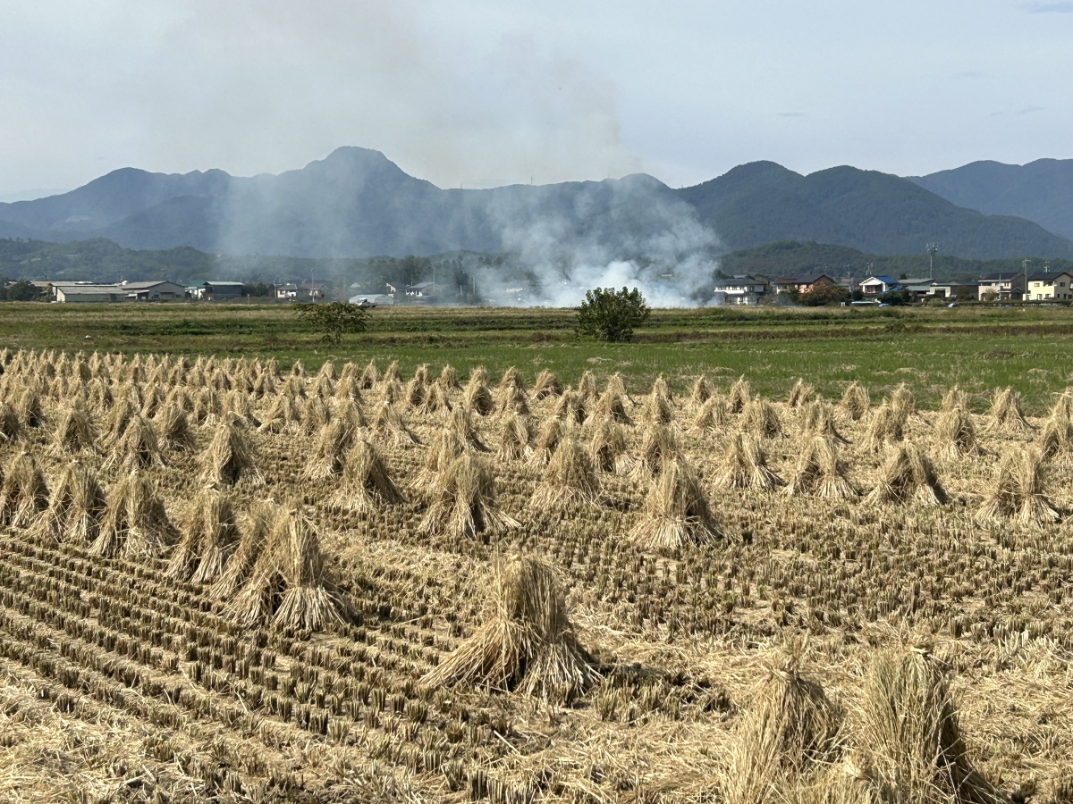 長野大学のある塩田平で最も「惜しみがたさ」を感じるのが野焼きの風景、そこに立ち込める白煙です。大学からの帰り道のこの日2024/10/22は晴天に恵まれ、白い煙が立ち上っていました。この地域の無形文化として「塩田平の野焼き」と名付けておきます。田んぼに整然と並べられる「にお」(三角錐状の稲束)も好対照をなして美しい。