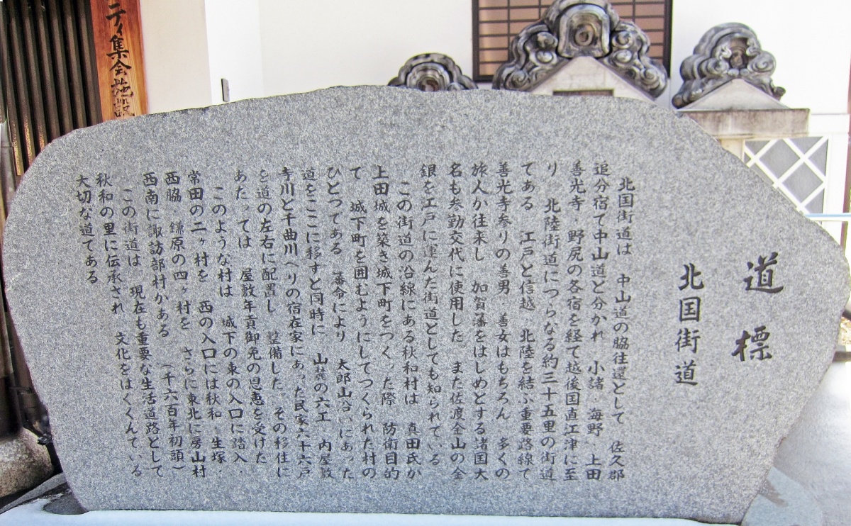 蚕室造りが立ち並ぶ北国街道沿いの、公民館前には、上田市の歴史を記した記念碑がある。蚕都として栄えた歴史や、当時の上田市、秋和の役割、歴史に基づいた街・道のつくりについての記録が記されている。