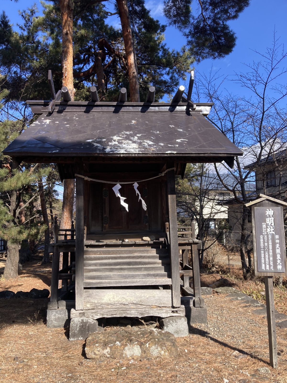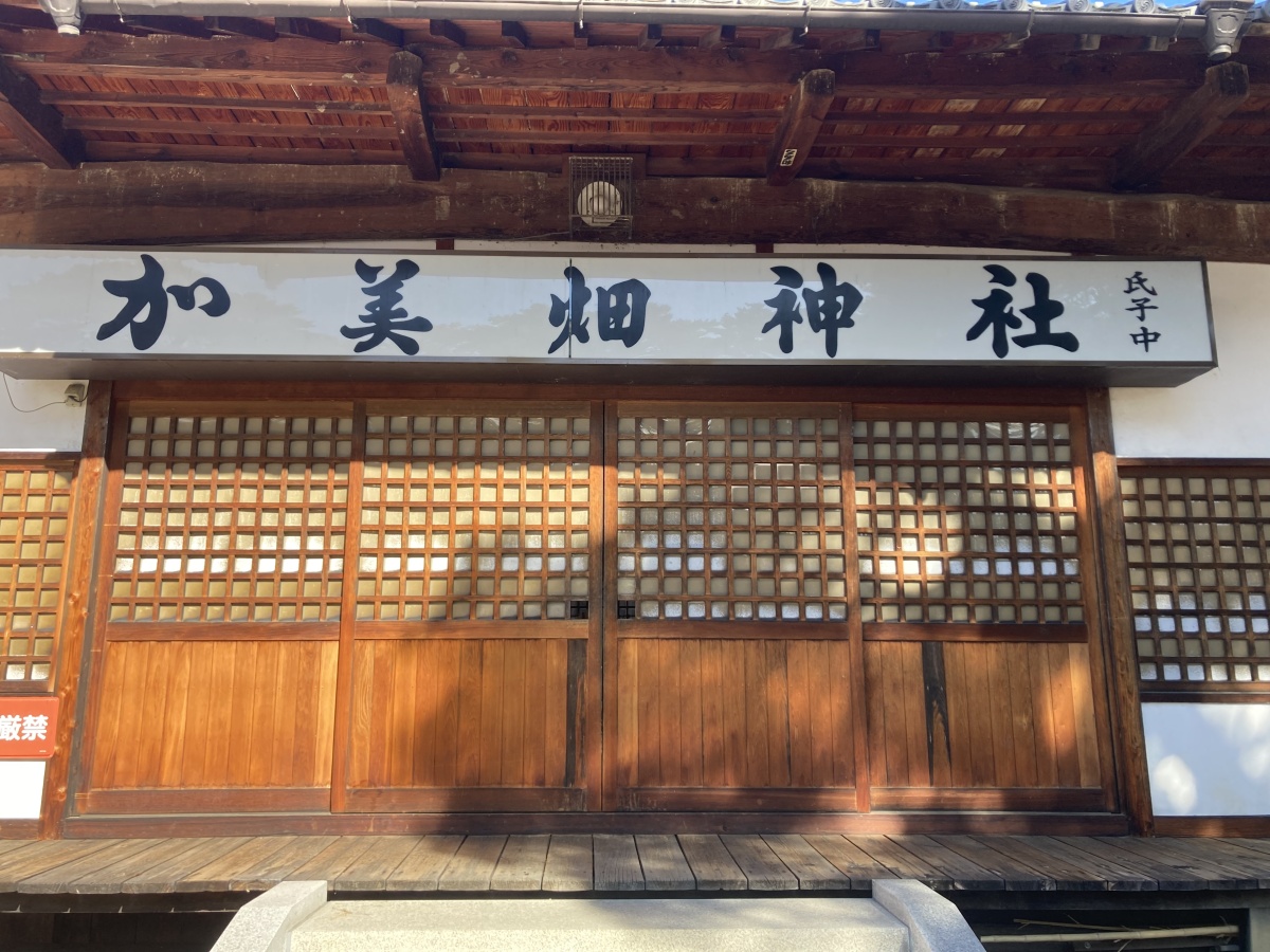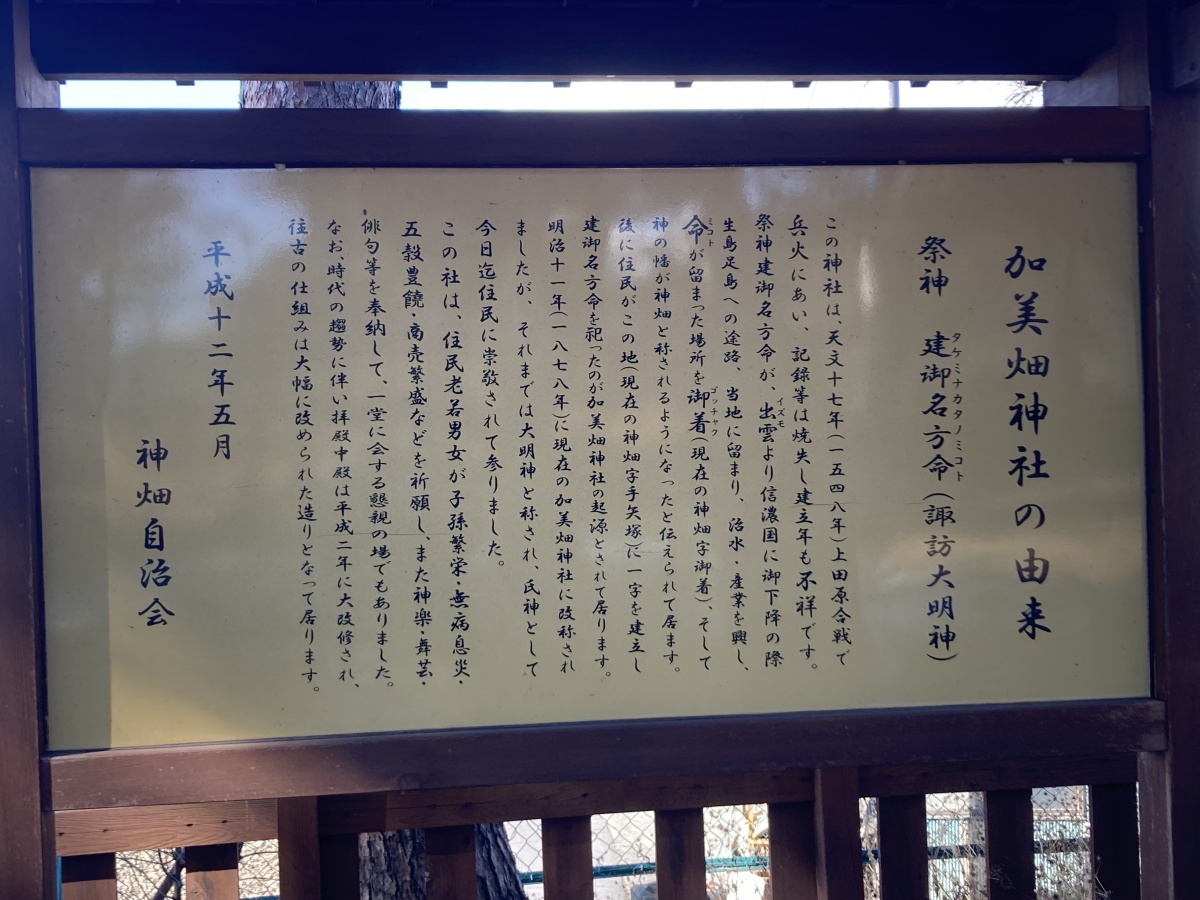 この神社は天文十七年に上田原合戦により兵火にあい、記録等が消失し、建立年が不詳となっている神社です。御祭神である建御名方命が、出雲から信濃国に御下降の際に生島足島へ行く途中、この地に留まり活水や産業を興し、命が留まったとして御着、神の幡が神畑と呼ばれるようになったそう。