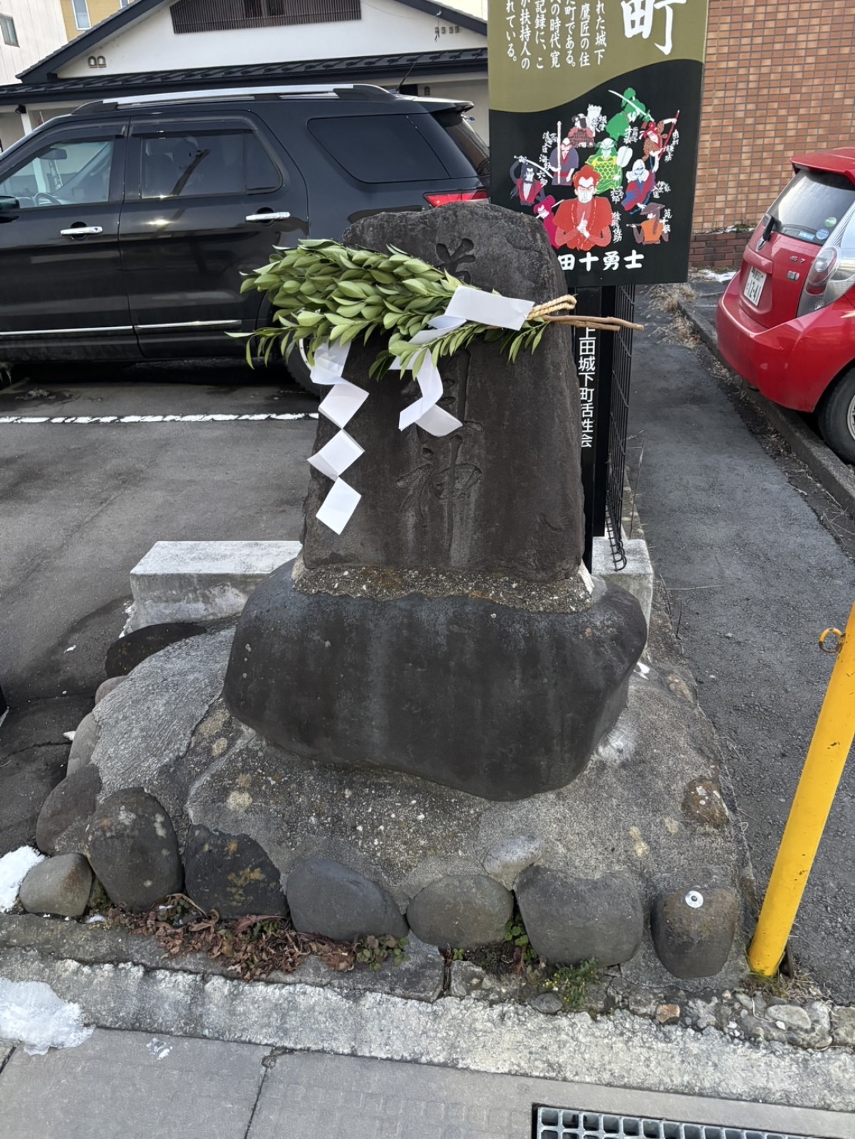 上田市中央にある道祖神 道祖神の石碑にしめ縄が巻かれていることから、道祖神祭りがおこなわれたと考えられる。 コロナ禍以降開催を見送られていた道祖神祭りだが、ここ2・3年は新型コロナウイルスの対策をとったうえで開催されている。
