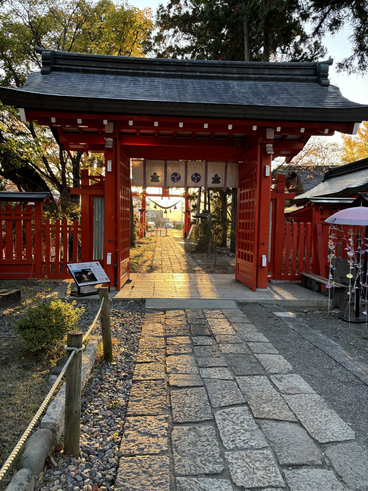 当写真は、生島足島神社の西鳥居を境内側から写したものです。夕日が鳥居の中を照らす姿は美しいです。